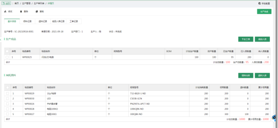 在生產(chǎn)單列表,會顯示全部生產(chǎn)單。在生產(chǎn)單詳情界面,可實現(xiàn)領(lǐng)料、退料、產(chǎn)成品入庫并可快速流轉(zhuǎn)生成工單。