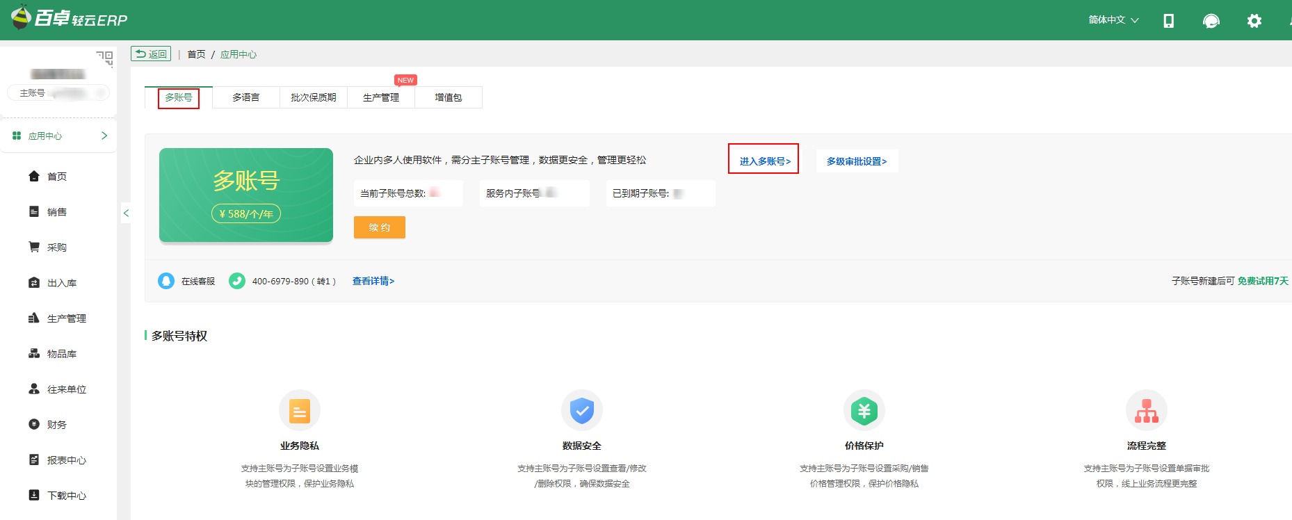 百卓輕云ERP—主子賬號分權(quán)限管理及費(fèi)用介紹